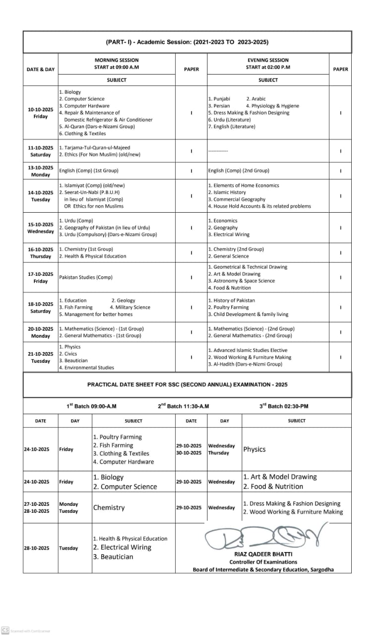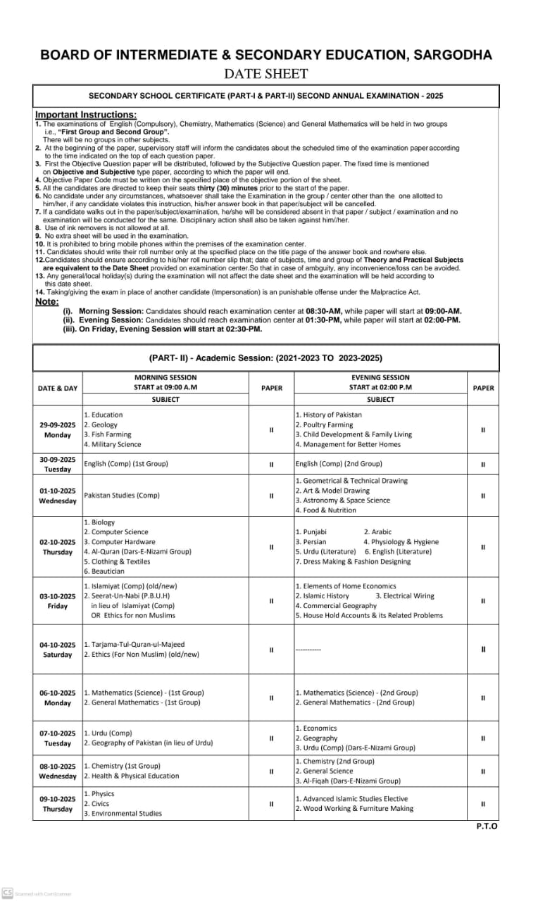 Download Date Sheet For the (Class 9th & 10th) & Composite (2nd Annual) Examination 2025