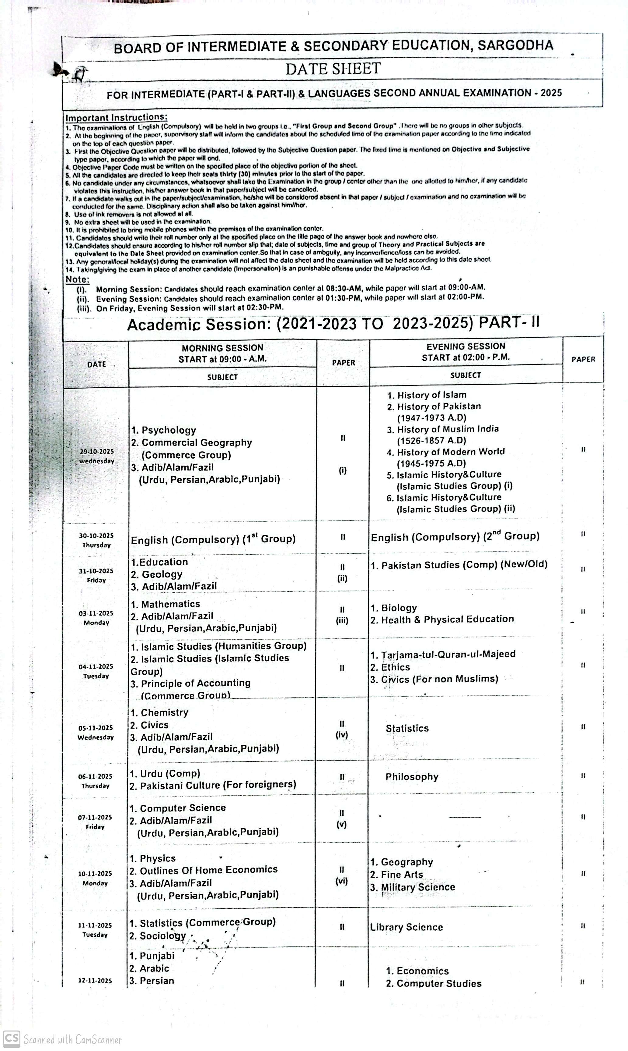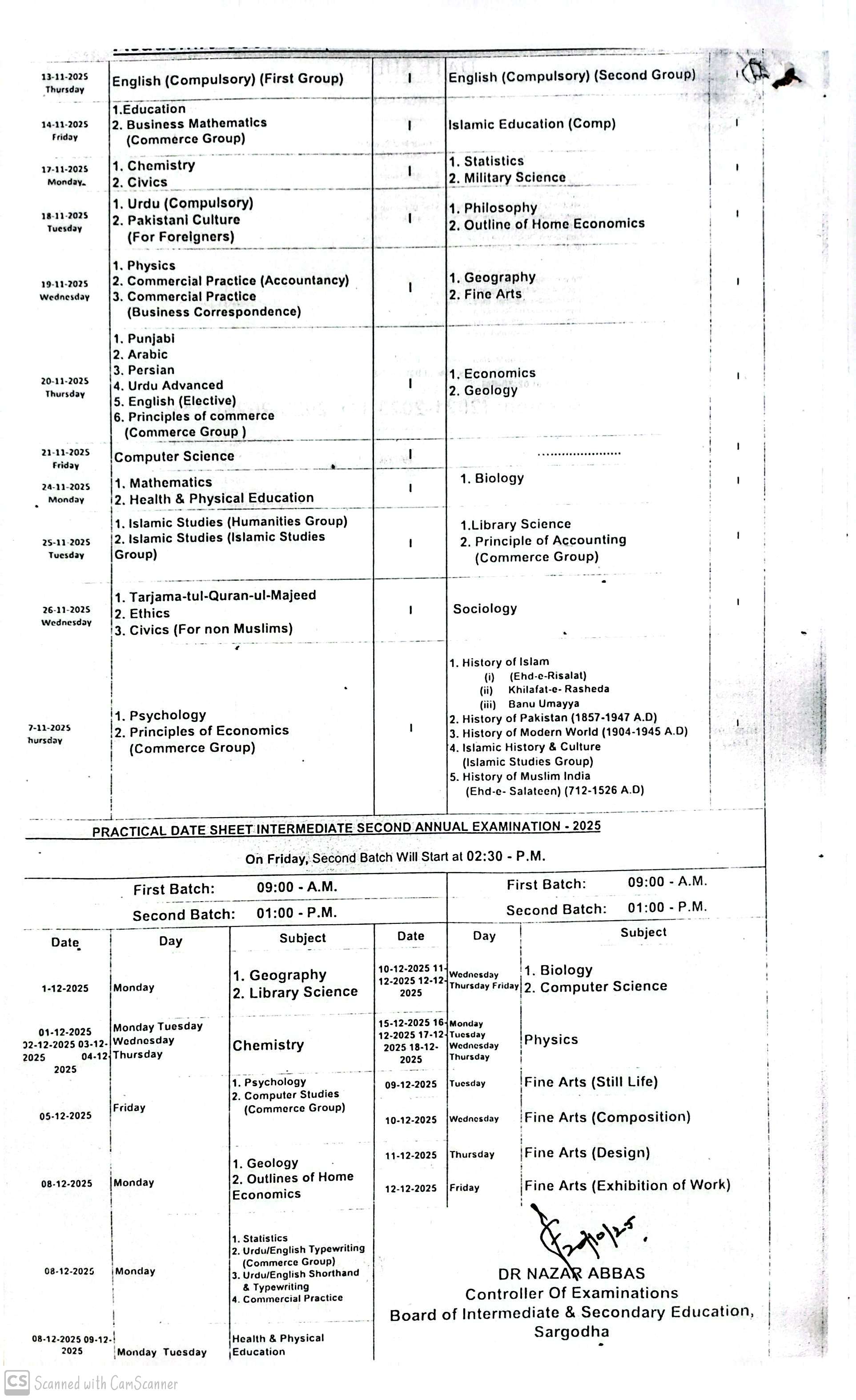 Download Date Sheet For the (Class 11th & 12th ) & Composite (2nd Annual ) Examination 2025