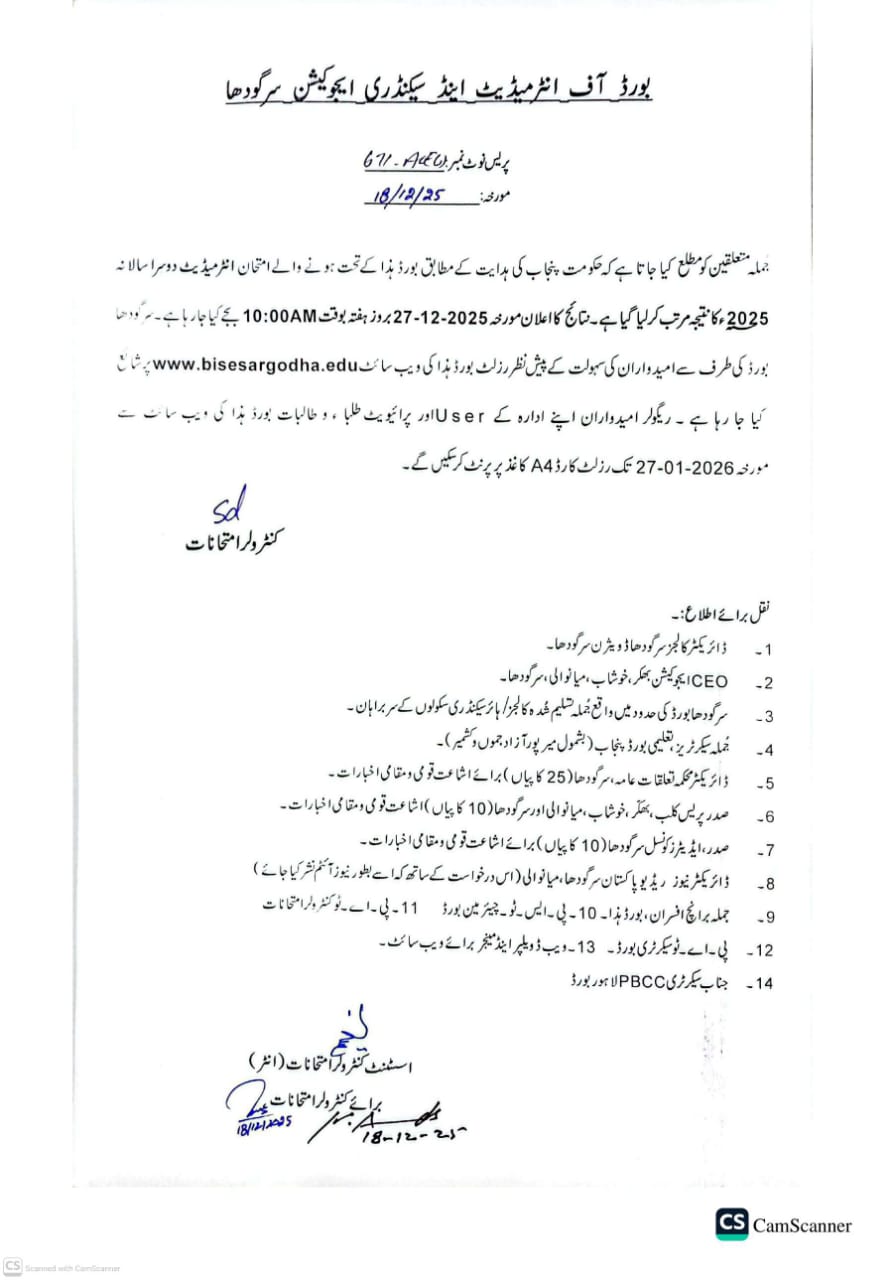 Press Note No 671-ACE(I) Regarding Result Announcement of HSSC 2nd Annual Examination 2025 Dated 18-12-2025