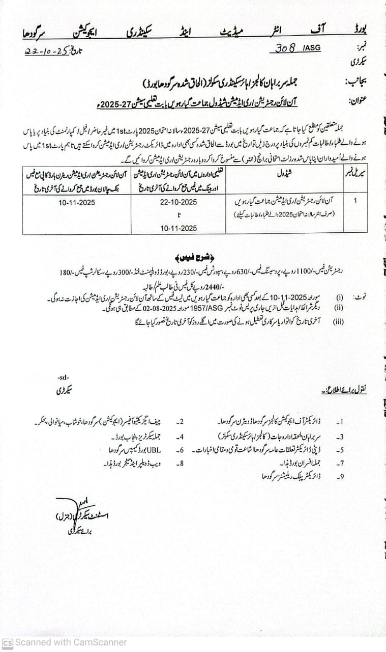 Schedule for Re Admission of 11th Class for Session 2025-27