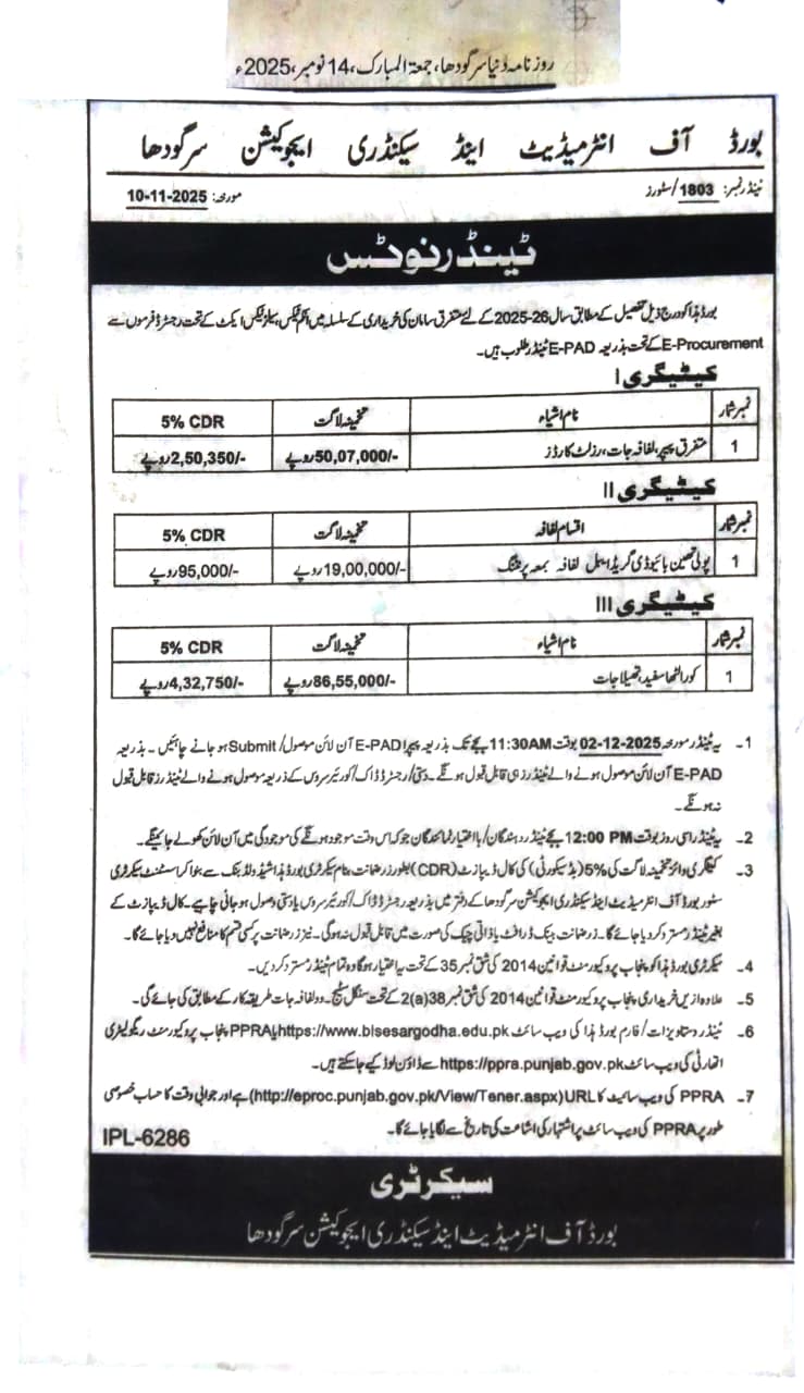 Tender Notice for the purchase of (Category-I) Different Paper, Envelopes, Result Cards. (Category-II) Polythene Biodegradable Envelopes. (Category-III) Cora Latha White, Clothe Bags.