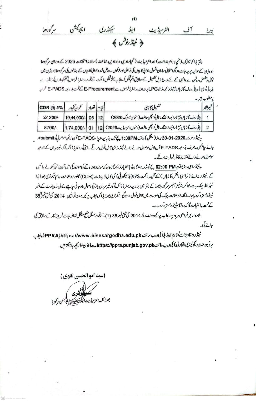 Description :-Tender Notice SSC & HSSC Annual Examination 2026 for Hiring of Private Vehicles